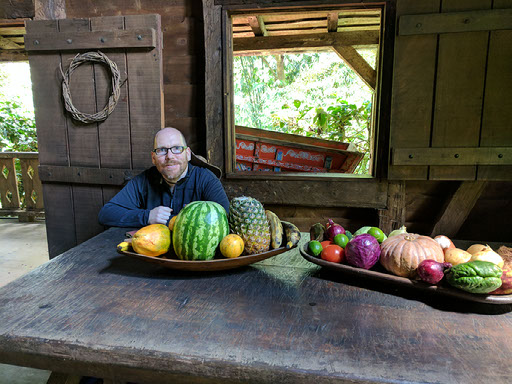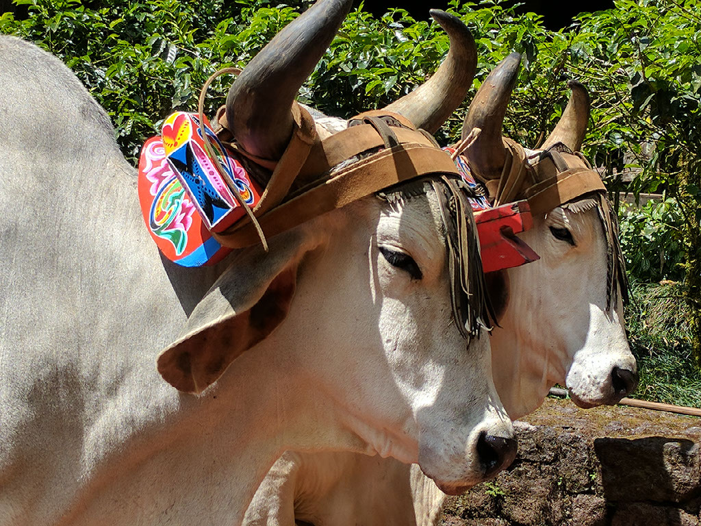 These guys are outside the traditional Costa Rican farmhouse, which we enter and are treated to some snacks: sugar cane water with milk, and a kind of corn cake which tastes like a solid block of rice pudding. There are fruits of many colours, and outside some lazy cows and a rabbit hutch.