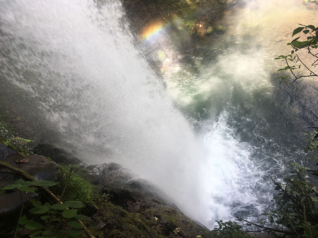 Wow! Like, seriously, wow. An actual rainbow poking out of the waterfall. That’s quite the finish to this tour and worth the ridiculous stair charade of a minute previous. I wait a bit, looking over at that bridge because I think it’s where the shuttle bus goes from and I’m waiting to see if I can see Helen. I don’t, so I head back up.