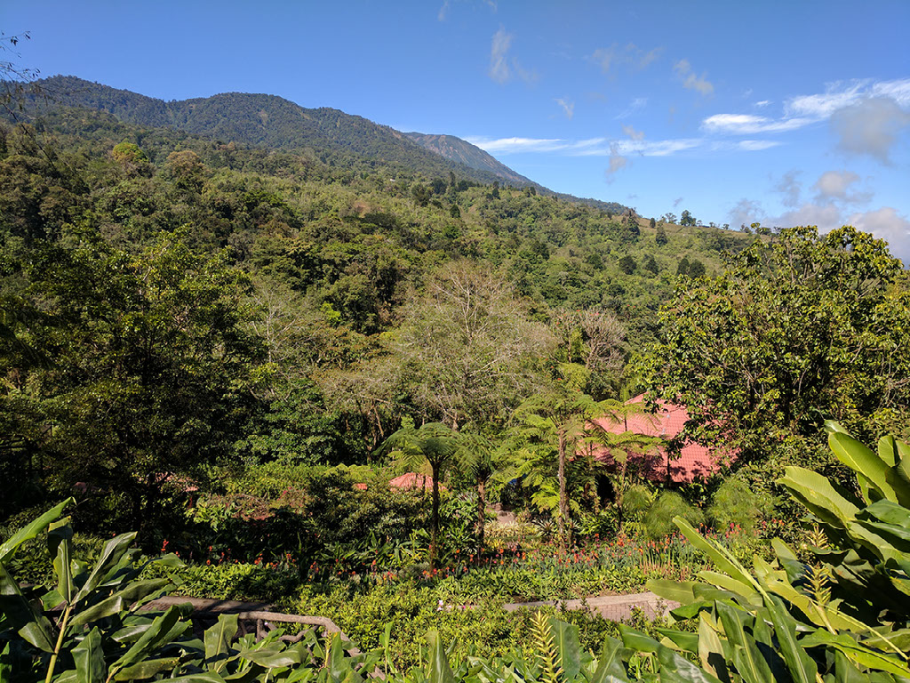 Views across Alajuela and towards other mountains and volanoes were spectacular, as always. Our route was almost entirely the same as the one to Volcan Poas, except this time we were told about the coffee plantations change from being family owned to corporate, the relentless march of property prices, the lovely road infrastructure being new courtesy of a recent earthquake which destroyed a village and the existing roads, and why the large fields of strawberries are covered in nets (to stop them being damaged by ash from the volcano).