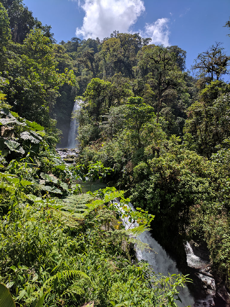 More steps. Lots more. We find a sign that says right and up for the shuttle bus back to the lodge and park entrance, or left for the remaining 3 falls. I’m reasonably sure the final one - La Paz - is the real attraction here, but anyway I want to see them all. Halfway down the slippery windy descent (73 steps, I later count) Helen’s legs go. The knees are all a-wobble and she doesn’t feel able to carry on. We both acknowledge that she’s a wouss, I hand her the rucksack and tell her I’ll meet her at the end of the trail.