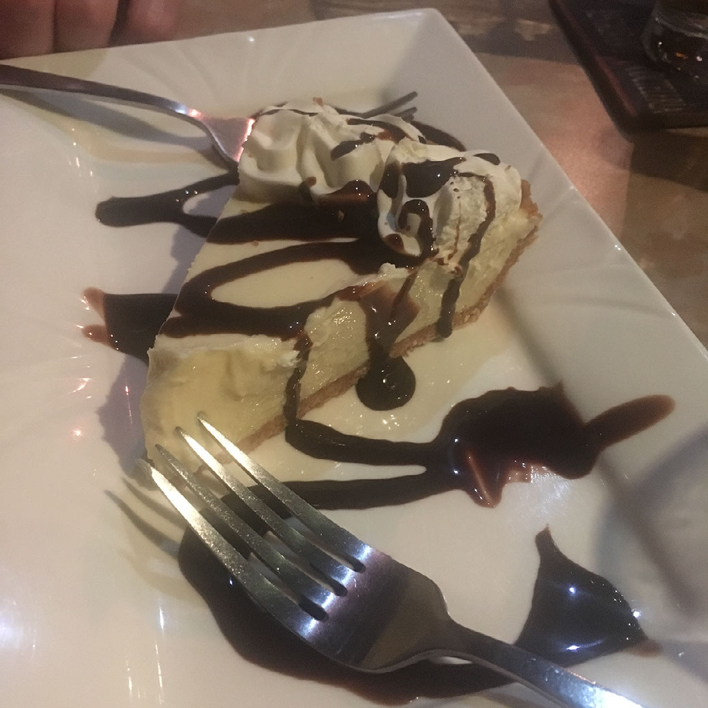 The food is bloody lovely. We’re hungry enough that it gets eaten before I even think to take a photo of it. Then we’re offered dessert, which I unilaterally accept and it’s this delicious cheesecake with wonderful chocolate sauce and nom nom nom.
