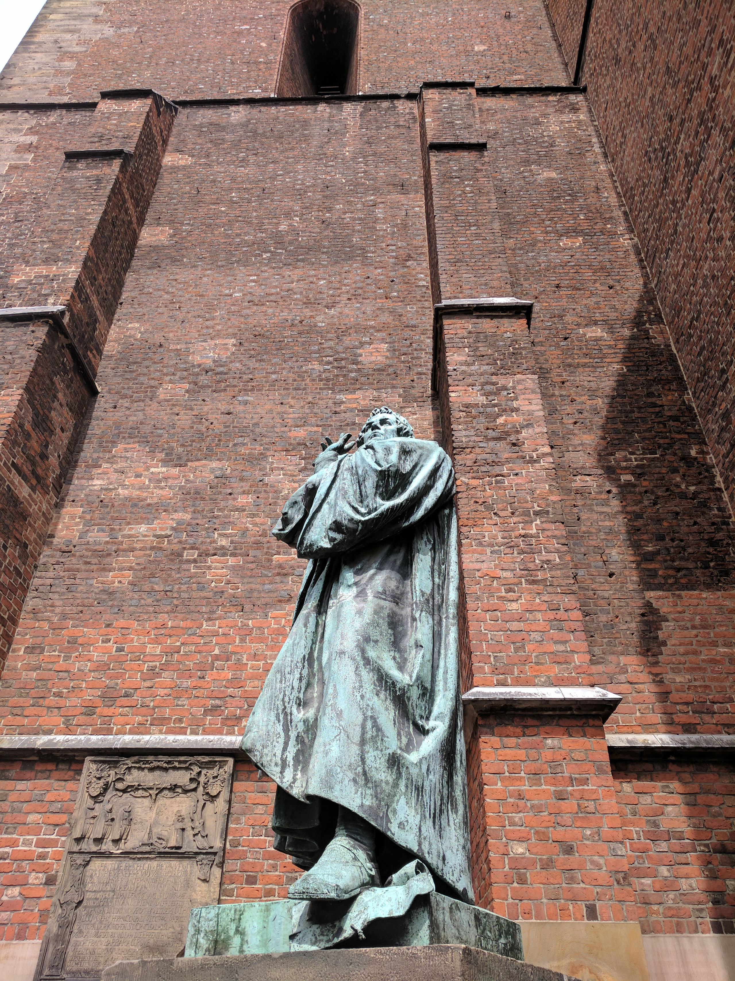 First off, the “old town”. Beyond a musical drain, huge tube station, and boring shopping street, was an ugly church and uglier other old building. This is certainly not Bremen. The church is Lutheran and outside it is a statue of Martin Luther, in full “check out my giant church!” pose.