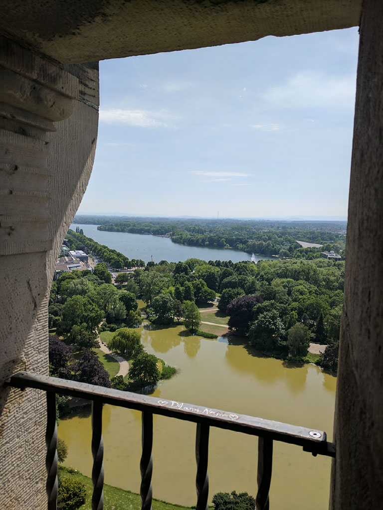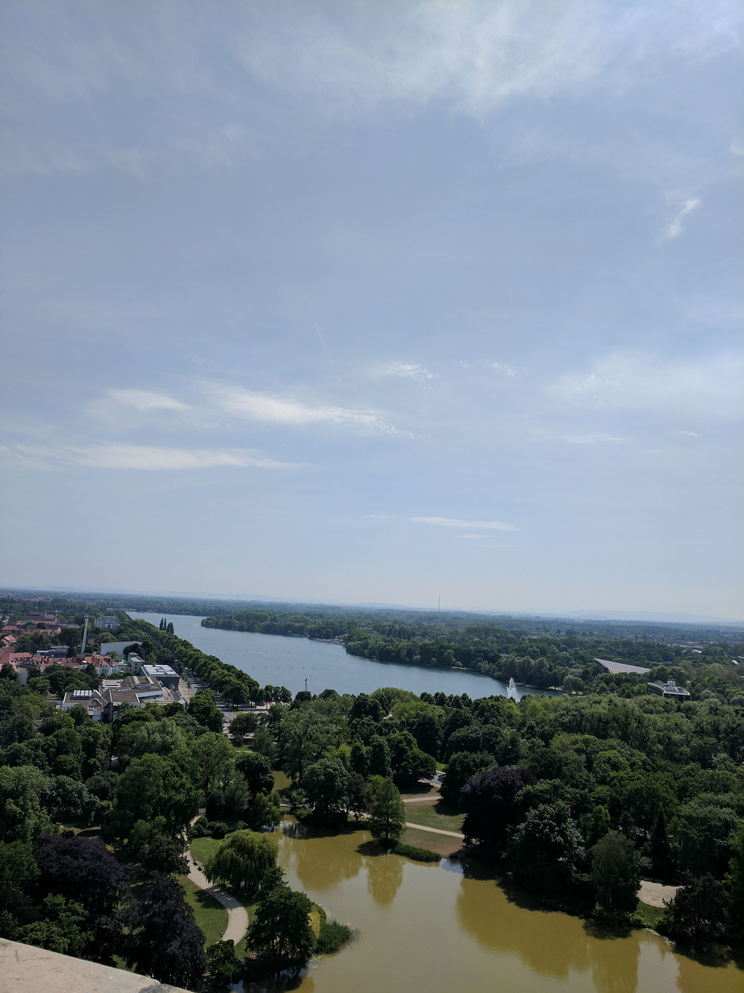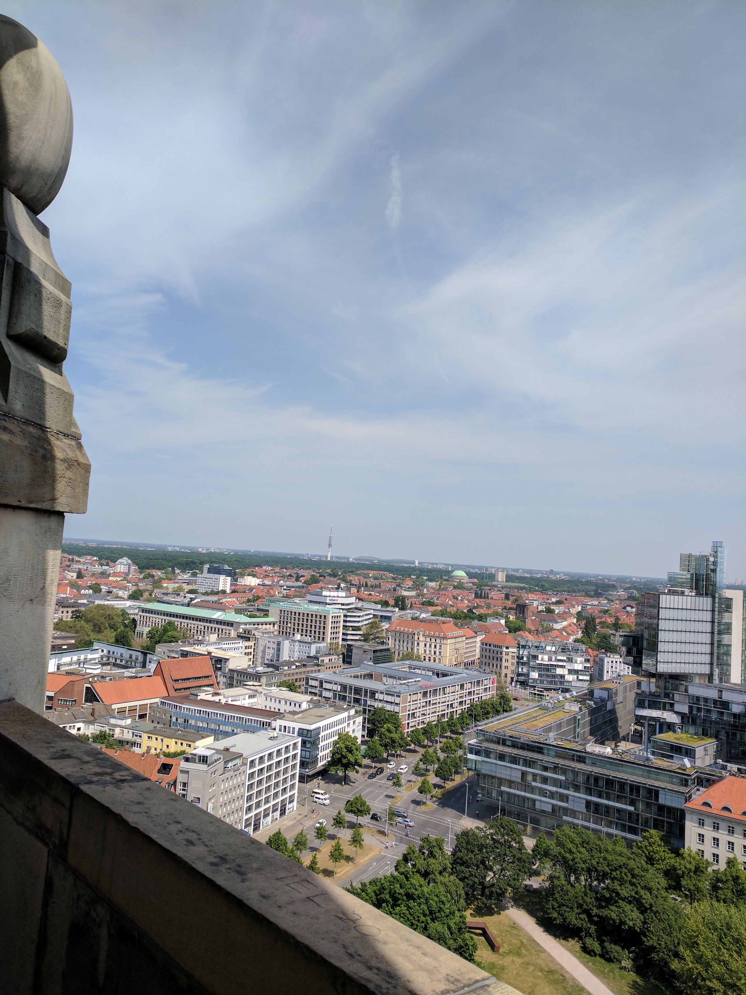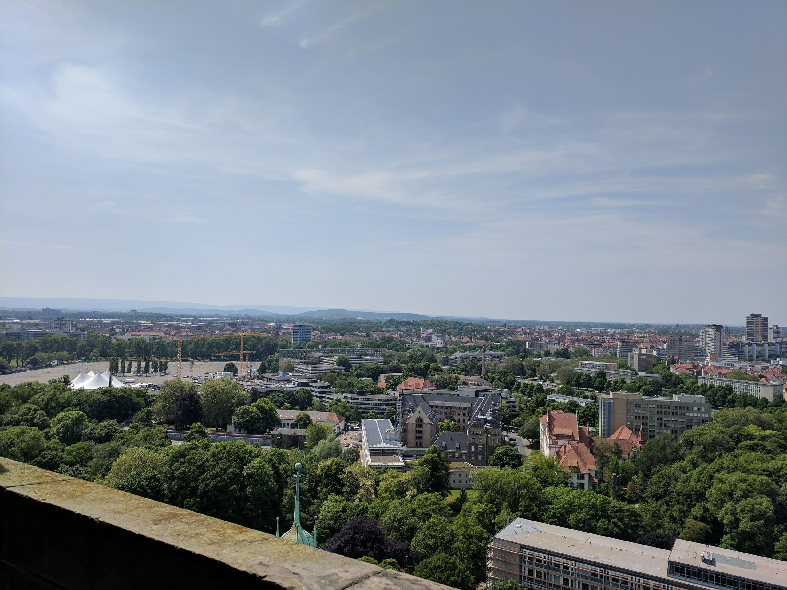 There’s actually another level further up. I grasp the metal bannister, fully intent to go downstairs and check on Helen and head back to the ground when a fit of bravery overcomes me, and up I go. It’s more of a struggle than the first set, and I almost instantly regret it. My watch, which records my heart rate 24/7, probably thinks I’ve just started a workout. The knees wobble like crazy, I’m having to consciously take very deep breaths, and I’m thinking: this totally wasn’t worth it. I’m not going to use the telescopes, no matter how tempting it is to look at things beyond Hannover city limits that might be pretty. No, I’m going to take one photo that betrays how far away I was from where you’re meant to stand, and then I’m going back down those fucking stairs.