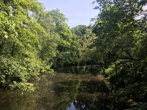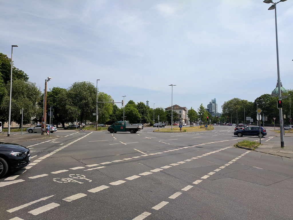 Nearby there was meant to be a castle. According to the map, it was the building just up the way, with pillars out front and otherwise covered in scaffolding. Didn’t look much like a castle to us. In fact, I declined to believe it was and instead suggested we go down schlossstrasse, because of schloss and that. Lo and behold, a poor excuse for a moat and some other non-castle-looking building frontage.