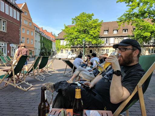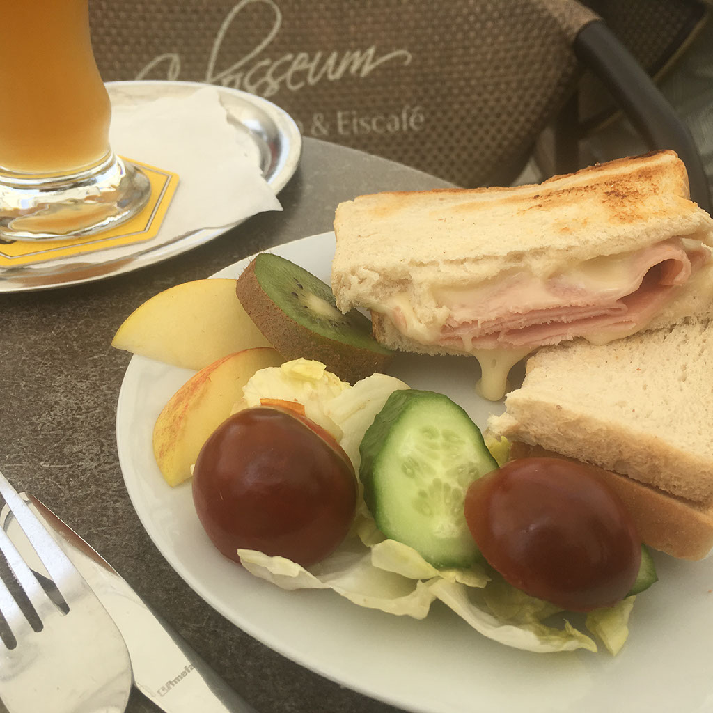 There’s nothing to do here but sit and chill. The waiting staff are very friendly, and again we talk solely in German. More ham sandwiches, a cheese cake that isn’t really a cheese cake, and two beers. In fact, make that three: later, having to revert to English due to a sentence I can’t understand at all, I’m offered a free beer because “I poured it by mistake, so you can have it”. Sadly, it’s alcohol free and tastes it, but hey a freebie’s a freebie.