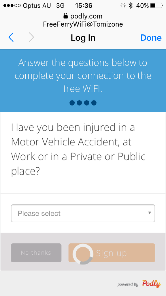 My phone signal is shitty and podcasts aren’t working well, so I try and get on the free wifi. It’s a fucking mess. They don’t accept postcodes or phone numbers which aren’t Australian, so I put in mobile of 41000000 and some random 4 digits starting with 2. But that’s not enough to get online: you then have to accept or turn down the chance to be contacted by marketing folk from funeral insurance companies, then fill out a 4 question survey, in order to finally be told that you’ve got an hour left of your 45 minute allowance. This is a half hour boat ride.