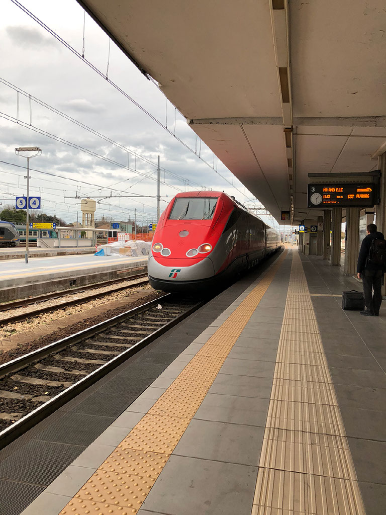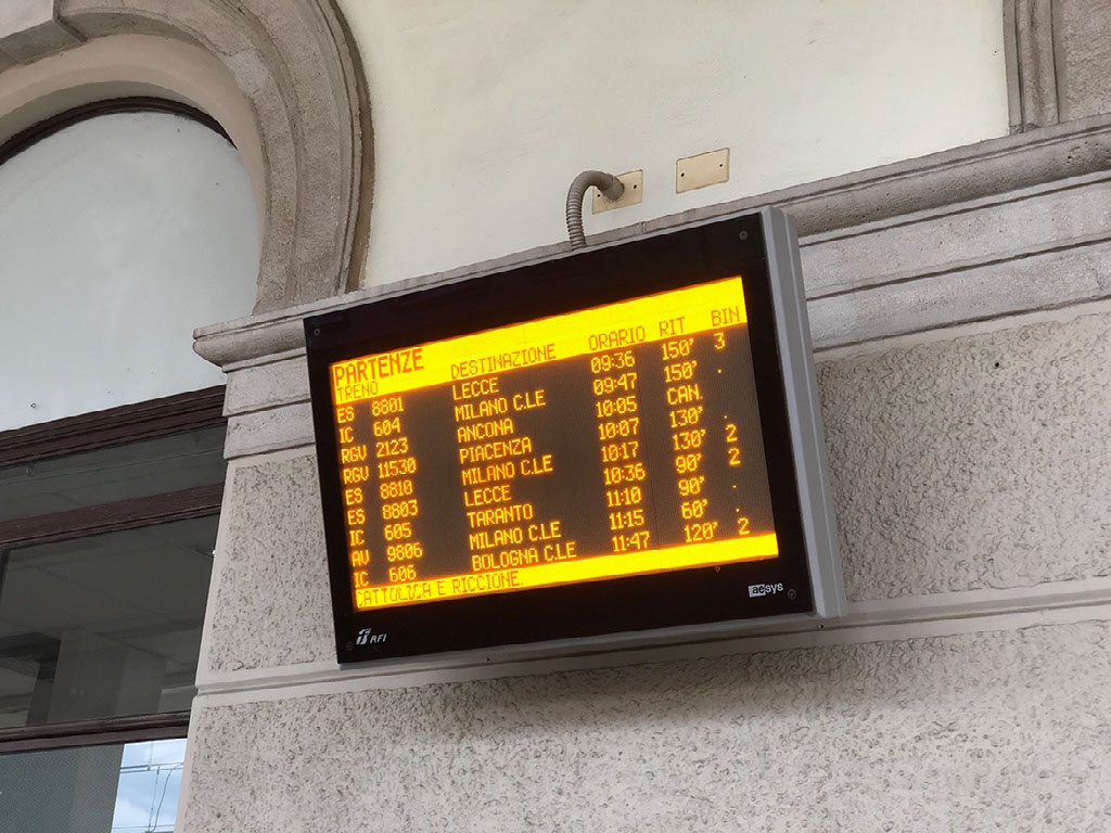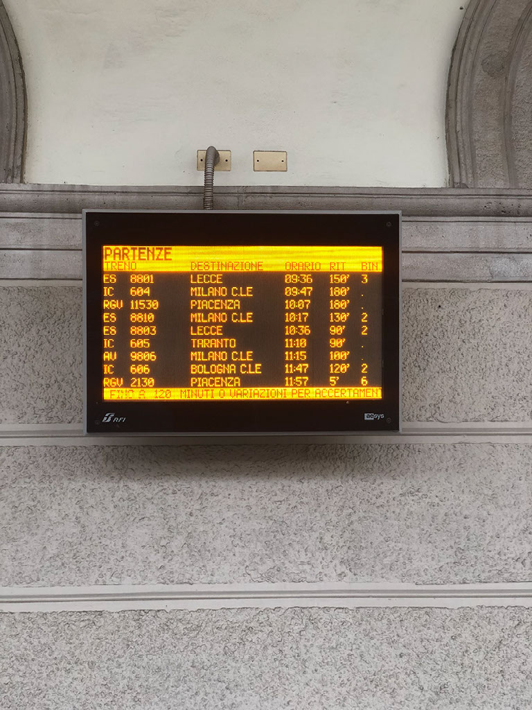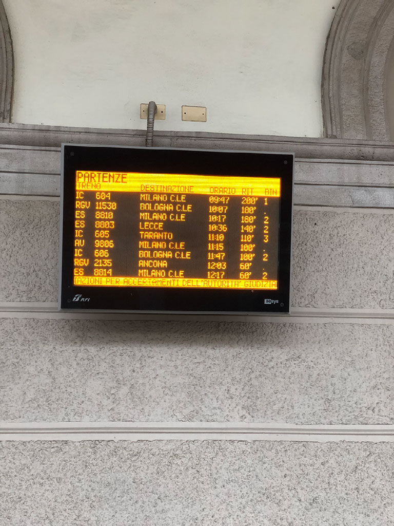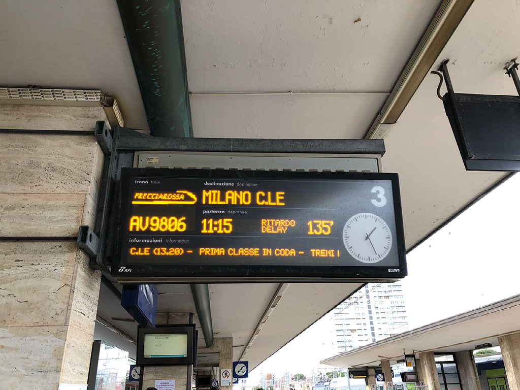Bugger. Hmm. Though I’m kinda laughing a bit. I can deal with fail, it’s quite funny, and besides I’ve got acres of time. What’s more, my train isn’t showing any delay - the 1115 Frecciarossa to Milano Centrale (pronounced “chen-trar-lay”, not “sen-trar-lay”, innit; dunno why it took so long for me to comprehend that the letter C is always hard in Italiano). I think perhaps, being a once day mega-fanciest-train-in-Italy service that perhaps it gets pride of place during disruption. It has come up from Bari, after all.