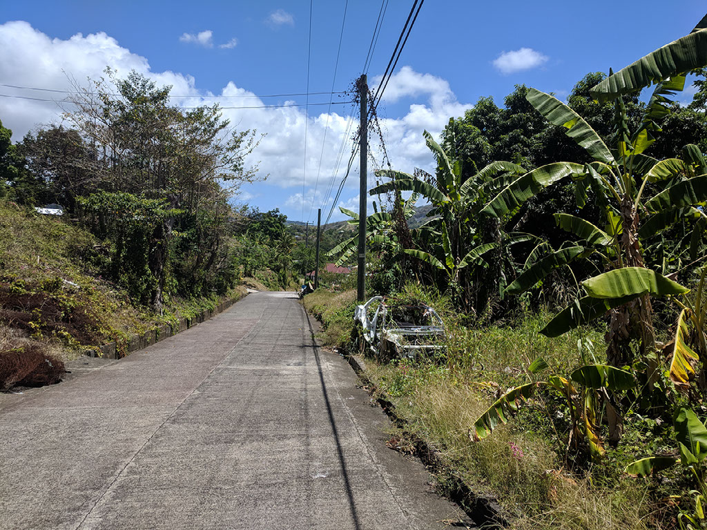 Back onto Sauteurs’s main street (called, I think, “Main Street”) we wandered up the hill and past the Anglican Church, then around the corner past the various kiosks then the Jehovah’s Witness place. Every few seconds a number 9 bus would drive past and try to hail us with a honk, but we were eschewing public transport and in fact disappearing off the route and towards Levera.