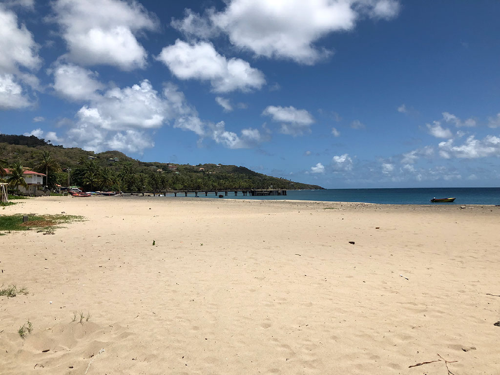 A chicken crosses the road ahead of us, looking like he had a very good reason which he was keeping to himself. A few minutes later we’re in Sauteurs proper. There’s shops and bars and a bus station full of minivans with the number 9 taped to their windscreens. Popping our head past FULL THROTTLE bar we step onto the beach and survey the scene. Turns out there’s a much better beach just a bit further along, so we wander past a few more shops then dive down an alleyway.
