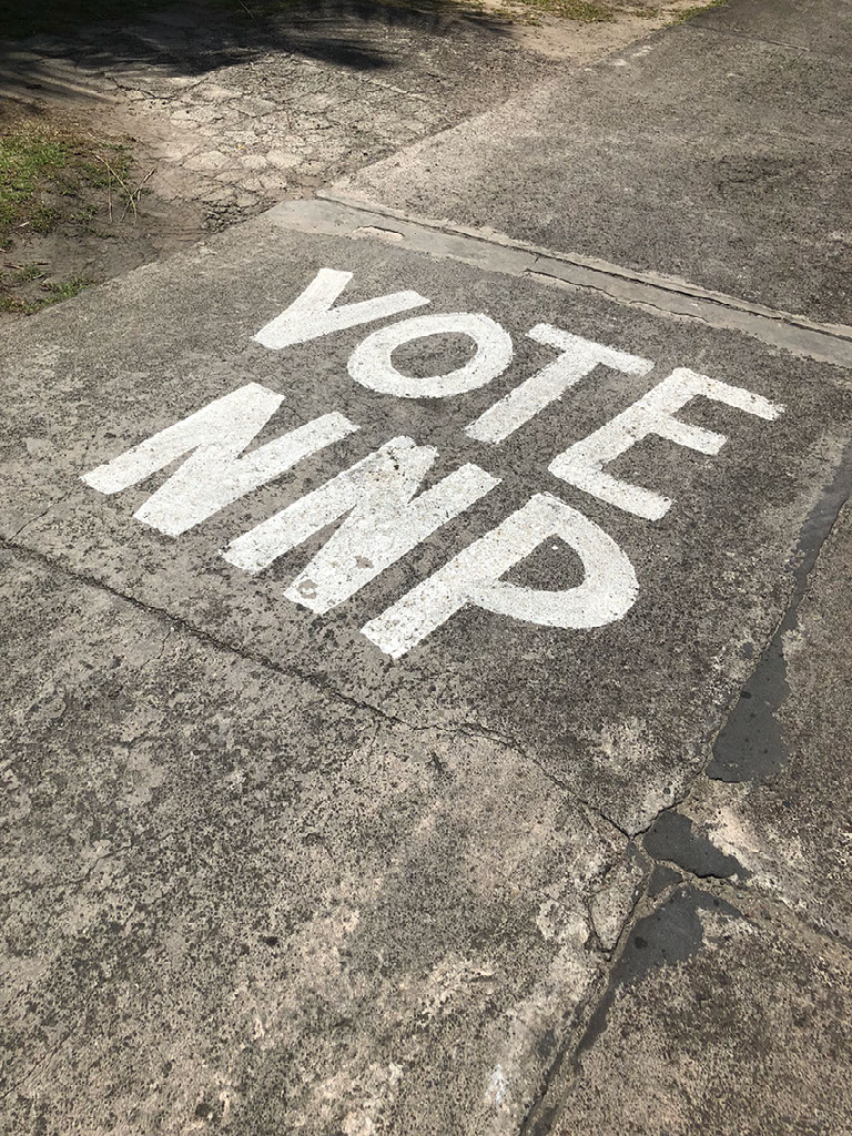 The hiking route isn’t countryside, but a mixed paved/gravel track winding up and down slopes with an ever-lessening frequency of housing and kiosks, but still a friendly wave and greeting from everyone we see except for at the place we later christen “The Corner of Unfriendliness”. Every few yards, like a weird Tour de France route, there’s VOTE NNP plastered on the ground.