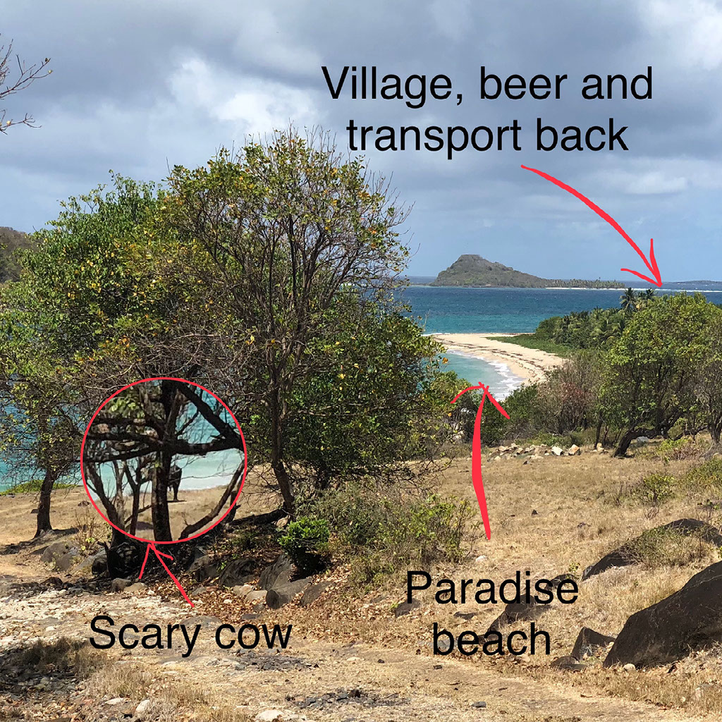 Crap. Let’s get this straight. We’ve walked just about 4 miles in middle of the day Caribbean sunshine up and down some pretty big hills, with a paradise-esque beach in our midst, and can’t carry on because of a couple of moody cows. Seriously?