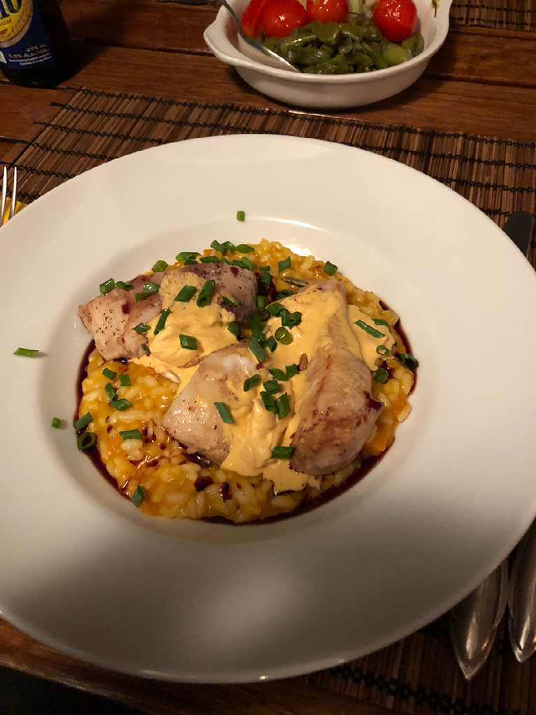 The pumpkin risotto with mahi mahi fish is hands down one of the nicest things I’ve ever eaten. It’s just staggeringly good, and I’m delighted Helen wants to hand me some leftovers. Nom nom bloody nom.