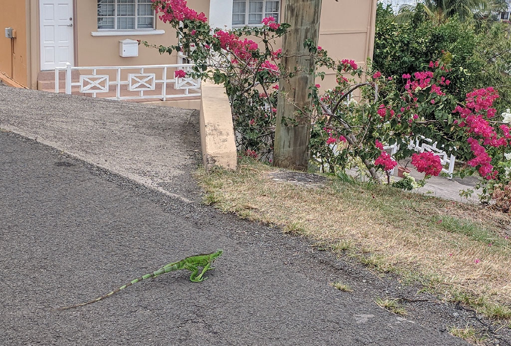 There’s no beachfront route; we have to go back up the stairs to the road which, unlike all those around Sauteurs, has something approximating a pavement. The little info pack in the apartment told us there was a food shop around 1km along the way; there is, and the route is almost entirely downhill and… oh, it’s shut. Curse you, bank holiday!