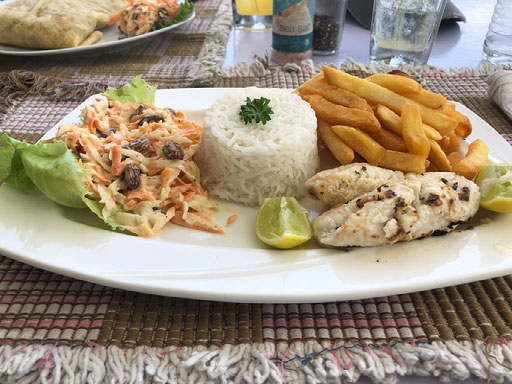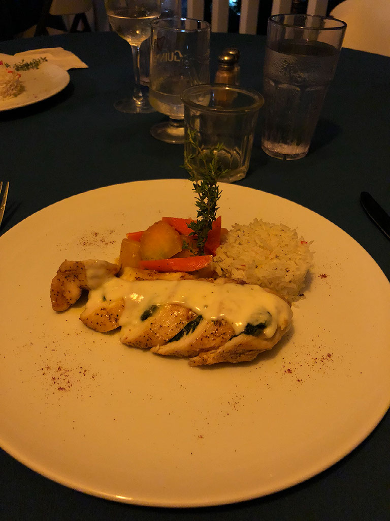 We both order the same main dish, a stuffed chicken breast with rice and stuff.