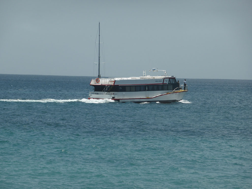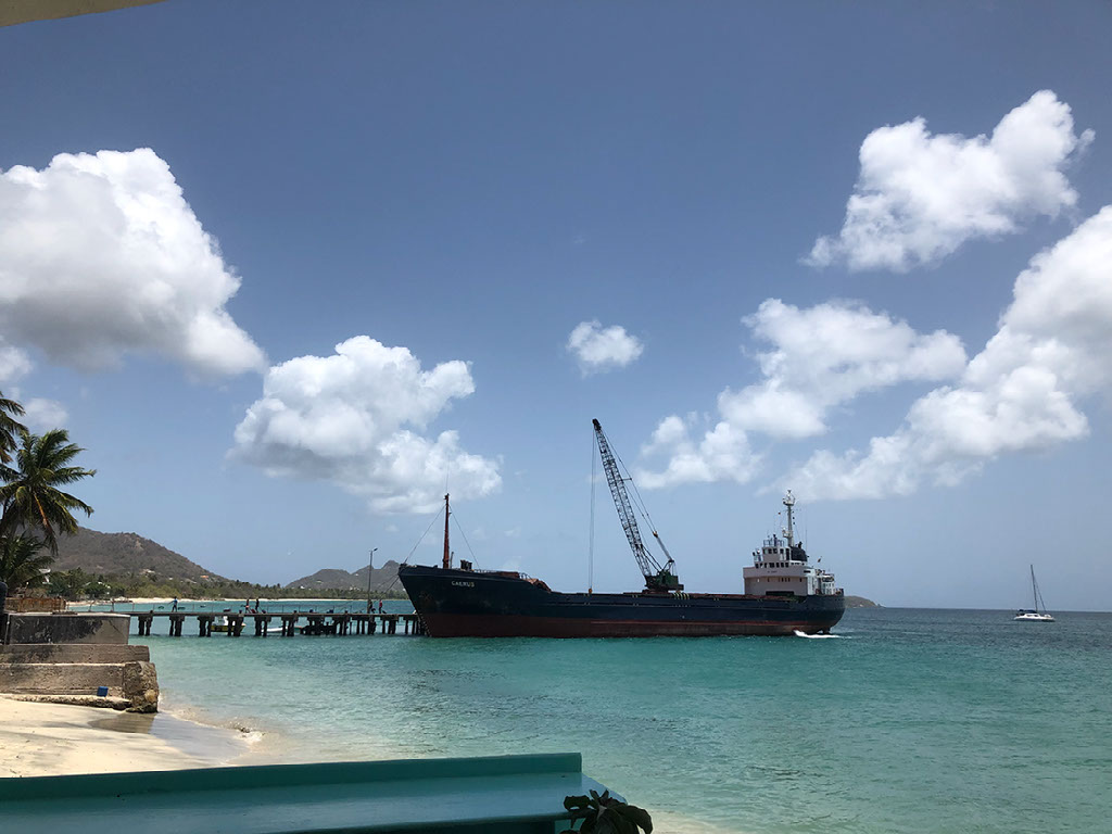 With the cargo ship barely away from the jetty, and people loading into dinghies still, the Osprey Express shows up so I pay for our drinks and another water, and we bugger off up the jetty. Surely all these schoolkids can’t be getting the boat back to Grenada? No, they’re not, they’re getting on our boat in order to then go through the central door and onto a smaller vessel – presumably this does the rounds of smaller communities on the island, or Petite Martinique, or both.