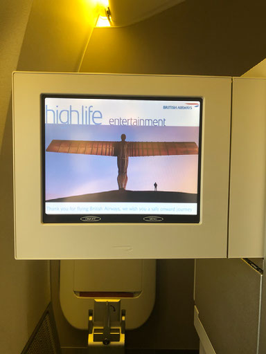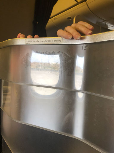 We’re in row 11 today, the final row of business class. The booking had originally been in first class, but they changed plane months ago ‘cos they’re mostly getting rid of first class from “all a bit” Gatwick. As it goes this is Helen’s first time in BA’s long haul business class and its ying-yang seats, alternating facing backwards and forwards. I’ve got the backward facing window seat and she’s actually quite impressed by the layout, so long as you’re a couple.
