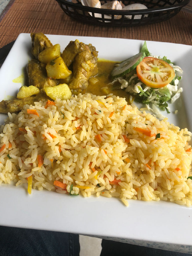 Beer starts to make me feel a bit more human. Water, on the other hand, isn’t doing much for Helen. But at around midday things look up, as we’re told some dishes are now available to order. Curried chicken with rice sounds good, thanks.