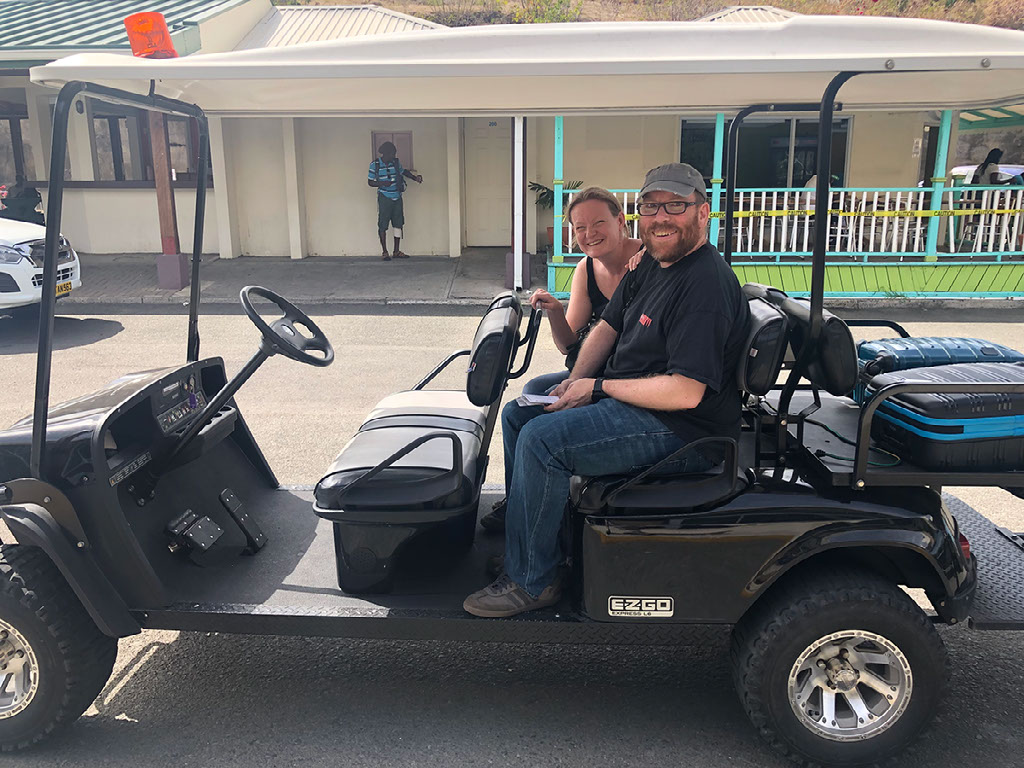 At the desk, our boarding passes are in fact already waiting for us, alongside an invite to the lounge. Asking how we get there, we’re told to just turn round and speak to the smiley woman standing directly behind us. She gives us a nice welcome and informs us she’ll be our driver today, because fuck yeah it’s time for a private golf buggy ride to the restricted area up the way where there’s a whole separate terminal for premium passengers like us.