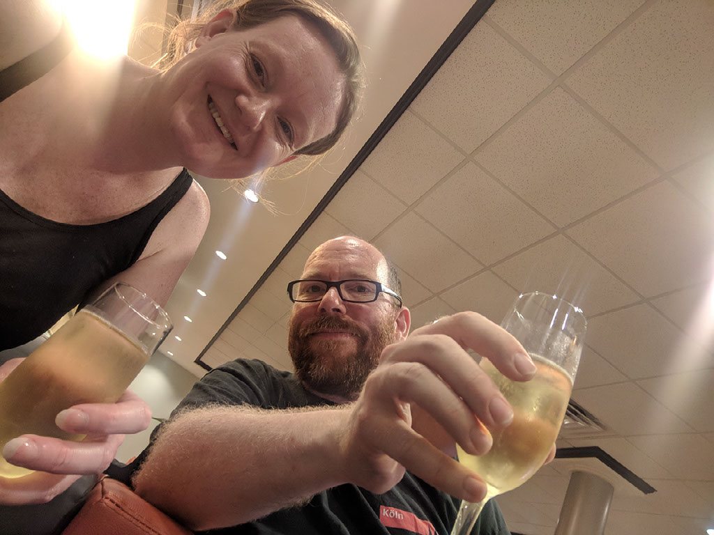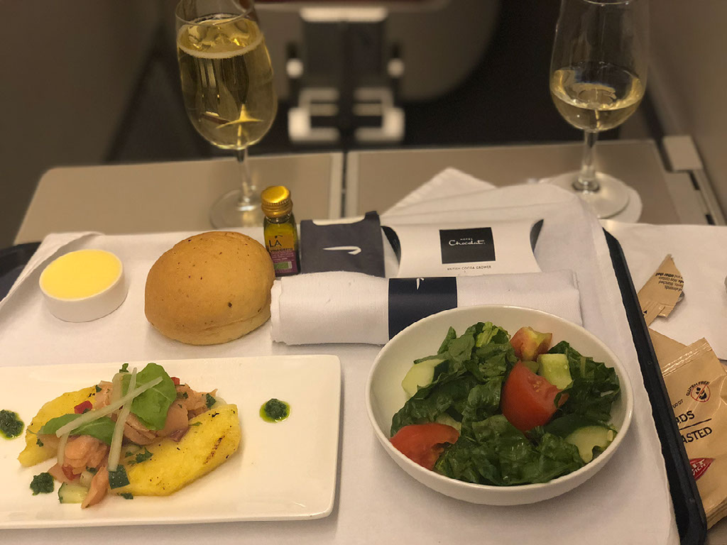 Pre-flight champagne arrives, somehow elevating our already high levels of smugness.