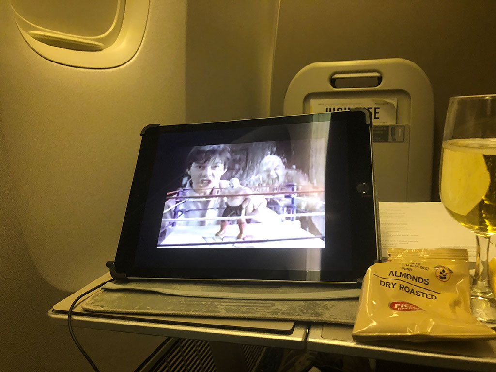 In the sky a second time, now dark, and midnight UK time, I’ve got nuts and champagne and an iPad showing a movie about wrestling fandom. It’s alright, this.