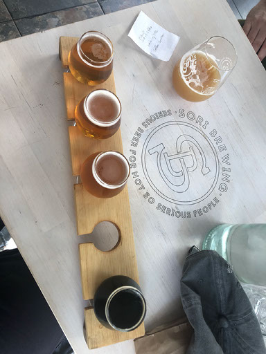 Andrei gets an IPA; I’m going for a tasting flight, and the barmaid arranges them in the order she would recommend drinking them.