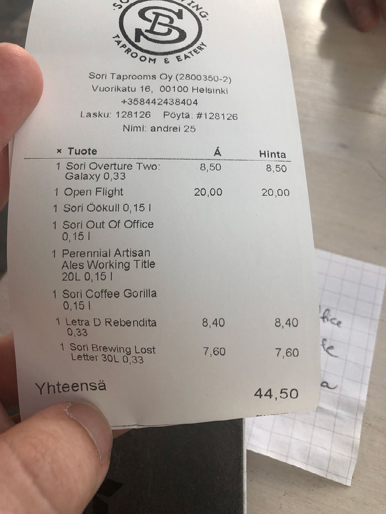 Anyway. It’s the Sori taproom. Sori, not sorry. Sori seems to be the hardest word. You’ll be Sori. Etc. They have a load of beers on both from their own brewery and guests from around the world plus big fridges full of bottles. We grab a table and stare at the menu and … wait, what? This is from an Estonian brewery, not Finnish? Damn it! But hey, we’re here now.