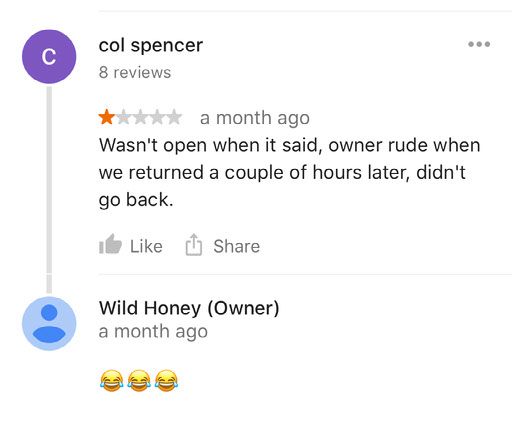 By the end of the second beer it’s dark and, like, 5pm or so, maybe later. A debate rages between conflicting voices in my head about what to do next. I could stay here and have another beer, or go elsewhere for another beer, or go buy some beer and take it back to the hotel. Also food might not be a bad idea. Research suggests that a nearby venue named Wild Honey might be nice; further research suggests that it might be awful, as indicated by the review above – where the owner mocks the complainant.