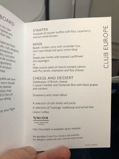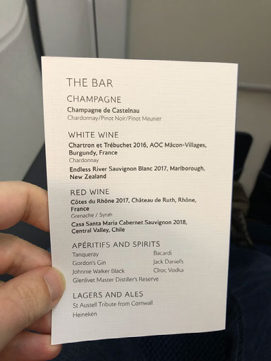 Everyone’s onboard pretty promptly, listening to the captain deliver his pre-flight speech to the accompaniment of REALLY LOUD FEEDBACK. Menus are handed out for food.