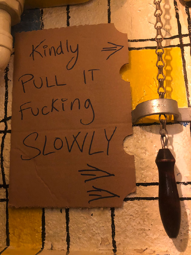 It’s tiny. The barman is nowhere near as friendly as the previous guy. The seating against the wall is uncomfortable because you can’t lean on the wall, as there are pictures hanging there. The toilet is so small it’s virtually impossible to turn round in it. The flush signage is instructional.