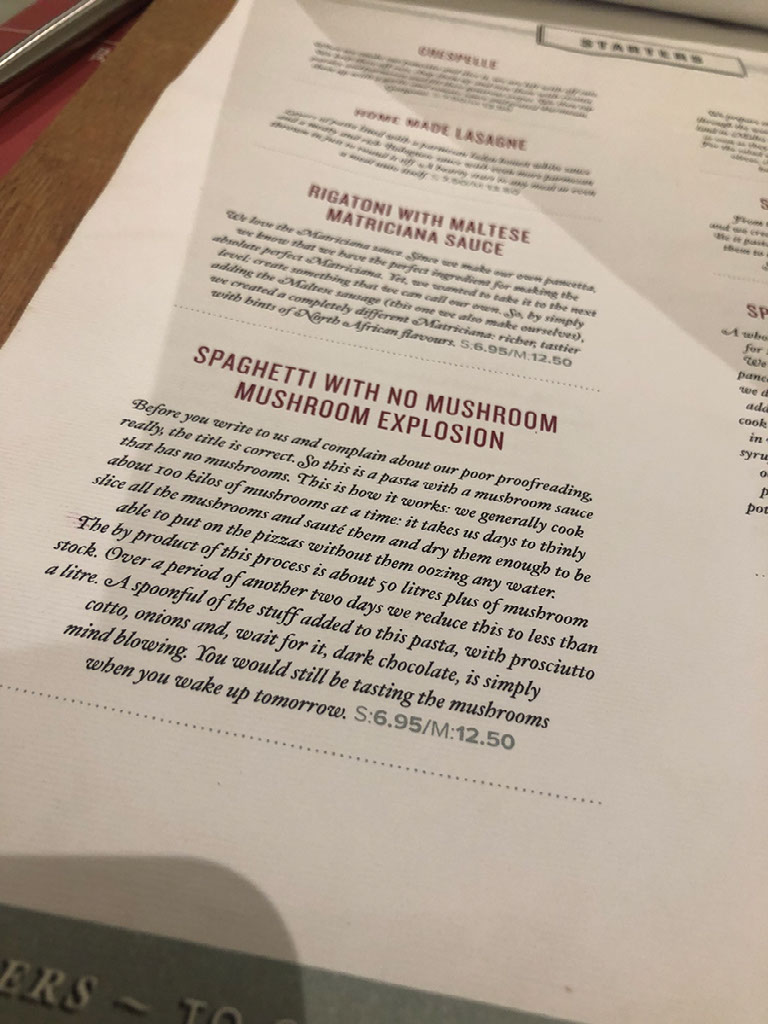 I’d say my eyes were bigger than my stomach but that’s a lie. Presented with a menu where each dish has a full paragraph written about it I’m like, come on, feed me the spaghetti with no mushroom mushroom explosion starter please.
