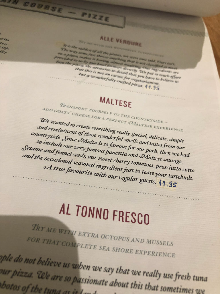 And then I figure I’ll have, in this authentic Neapolitan pizzeria, a Maltese pizza.