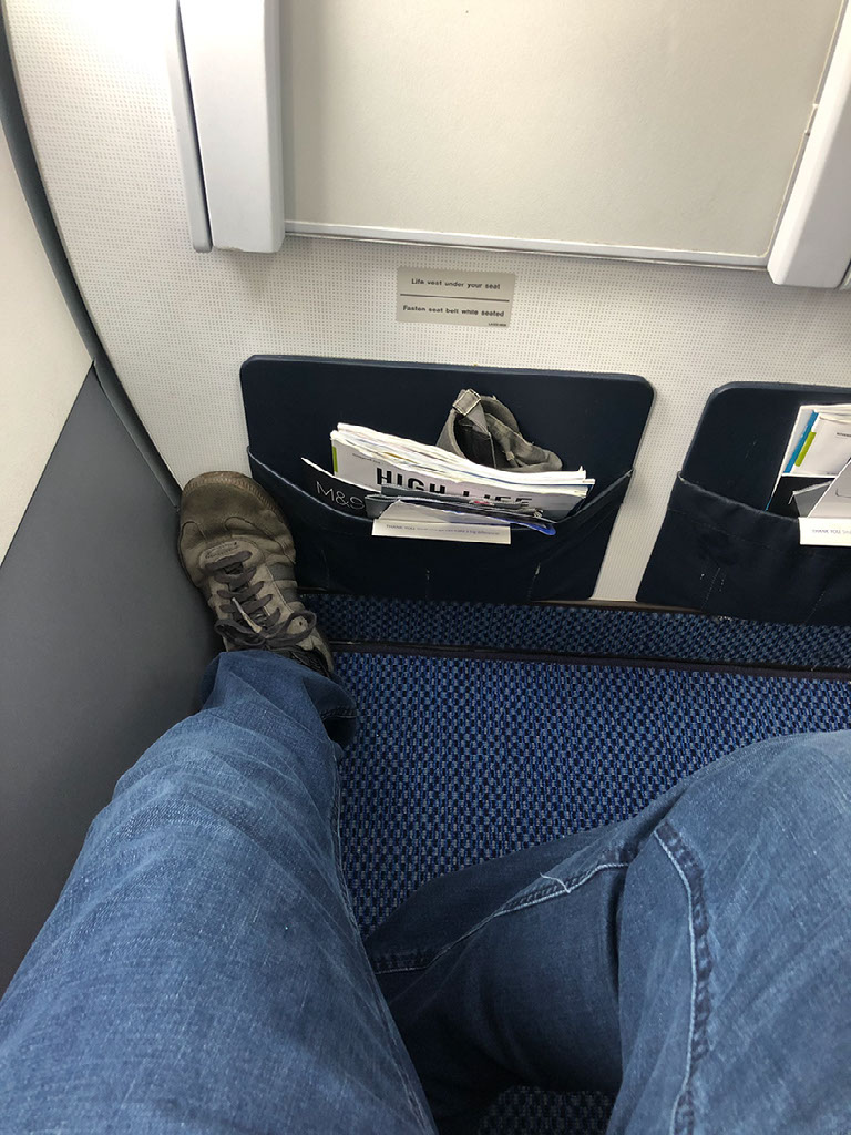 Gate 11 is immediately next to immigration and there’s loads of people already queueing up. After a few minutes they announced “we’ll be boarding by group number”, only to announce groups 1, 2 and 3 simultaneously. It’s a short walk across the tarmac and I take my seat, 1A. There is a surprising amount of legroom and it’s a wider seat than usual because the table is attached to the bulkhead rather than in the arm.