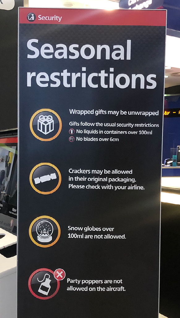 In Terminal 5 just after 0730, as we walk along to the First Wing I am delighted to read the specific baggage instructions for Christmas paraphernalia. NO BIG SNOW GLOBES.