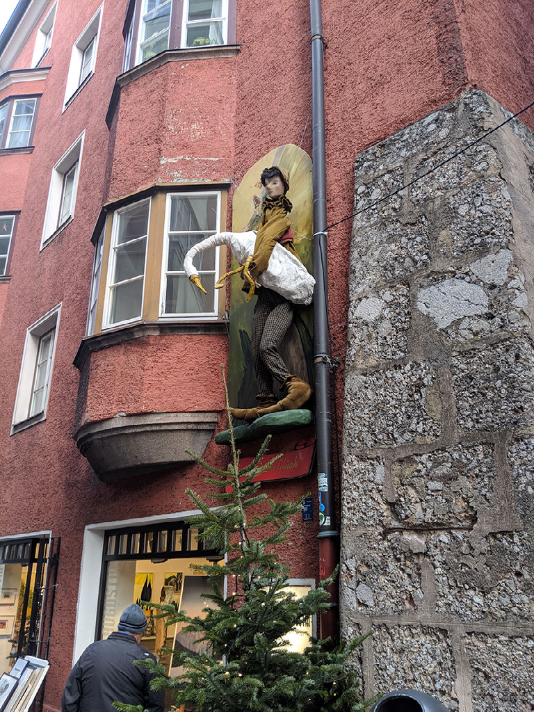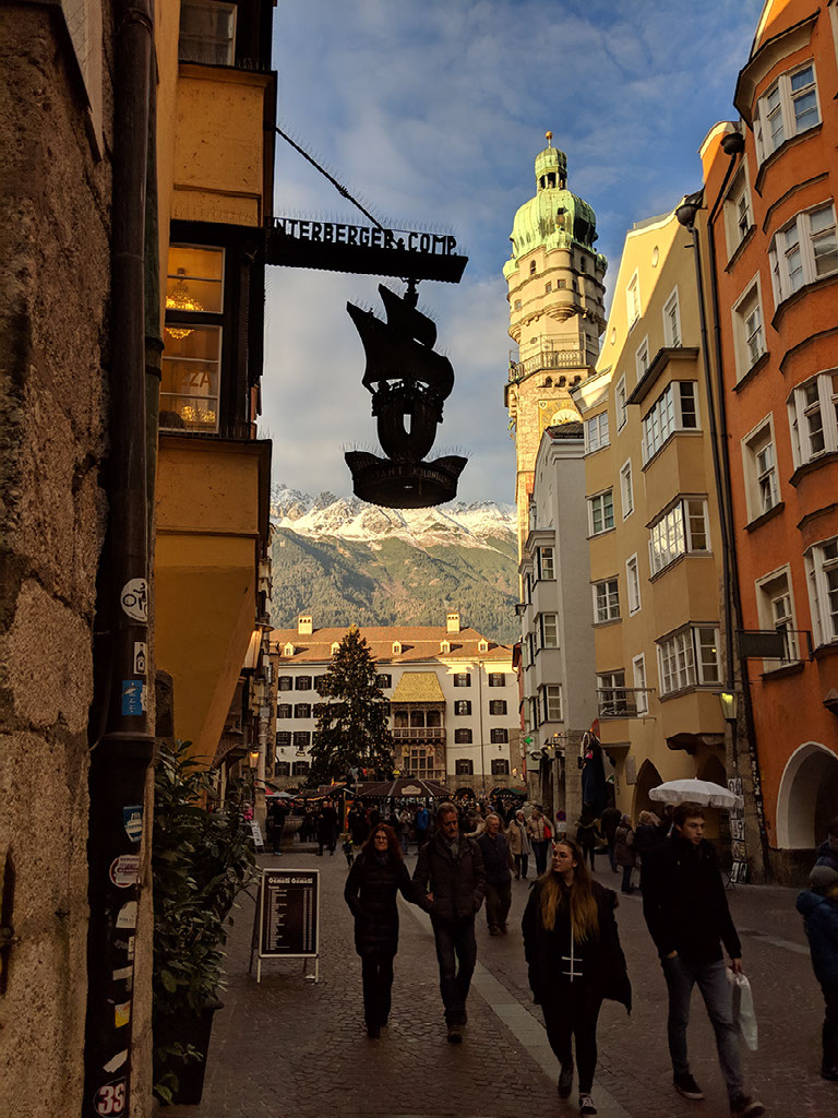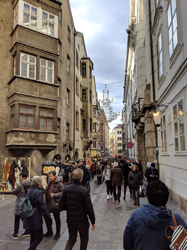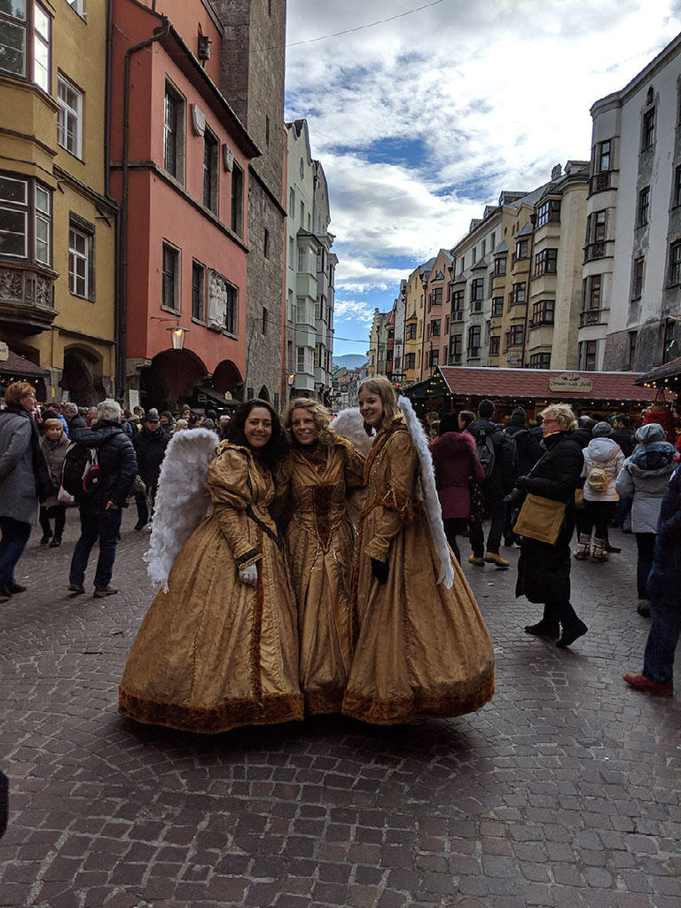 We’re at the Golden Roof, some big historical .. thing.. in central Innsbruck, at the head of a very large pedestrianised area with shitloads of stalls and thousands of people. It’s great. We stumble through the crowds and past the girls dressed as angels because wait what?