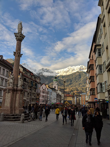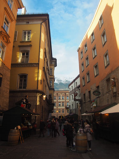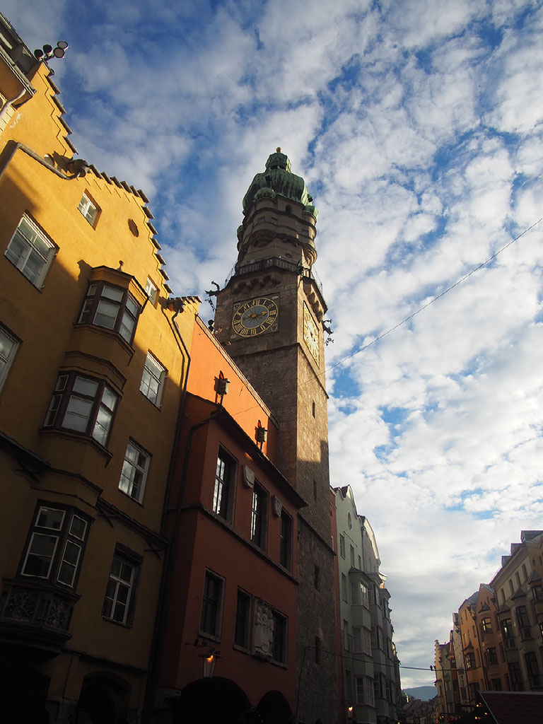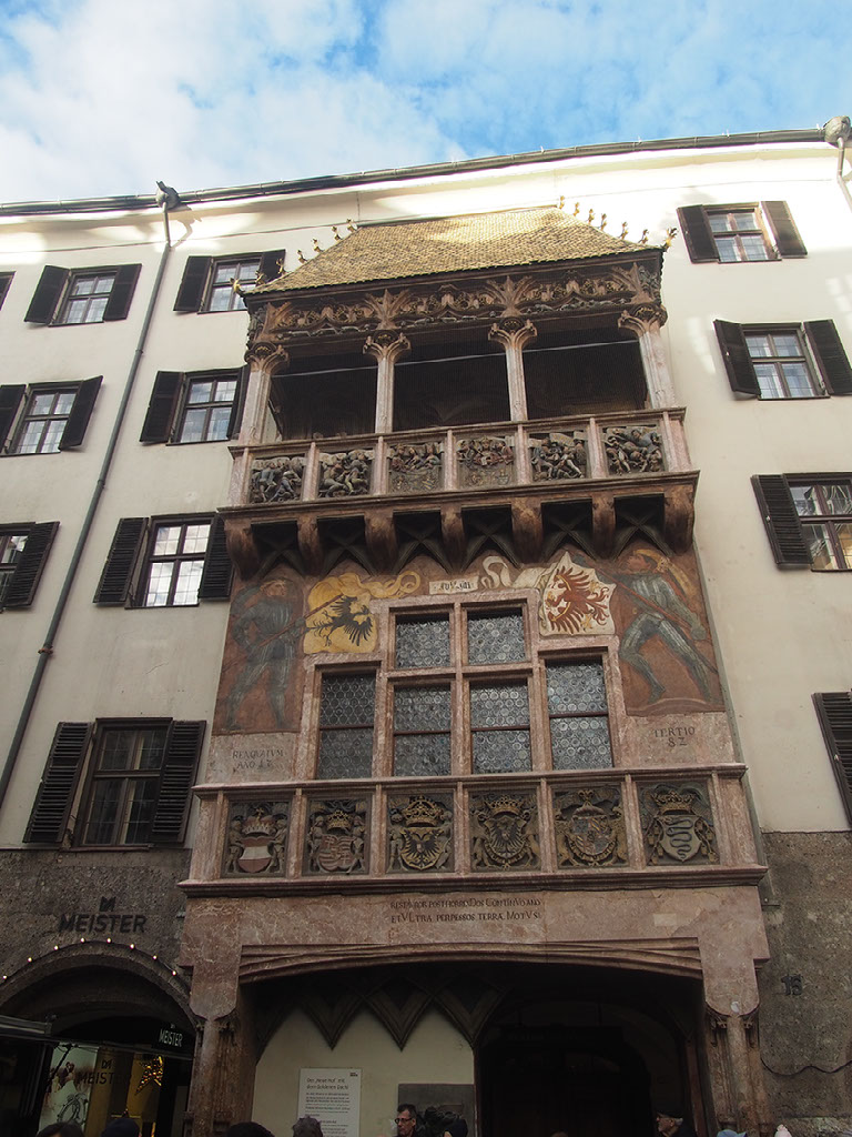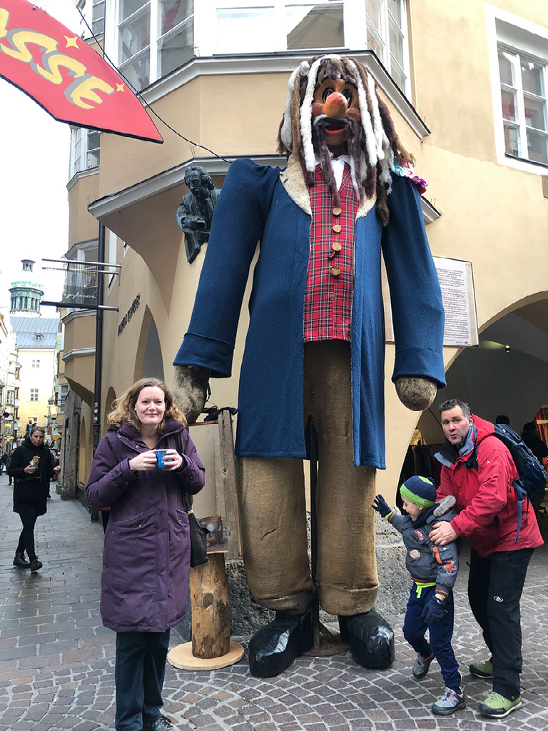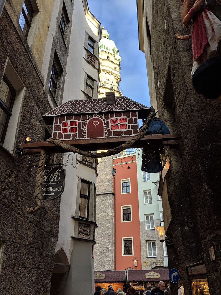 We’re at the Golden Roof, some big historical .. thing.. in central Innsbruck, at the head of a very large pedestrianised area with shitloads of stalls and thousands of people. It’s great. We stumble through the crowds and past the girls dressed as angels because wait what?