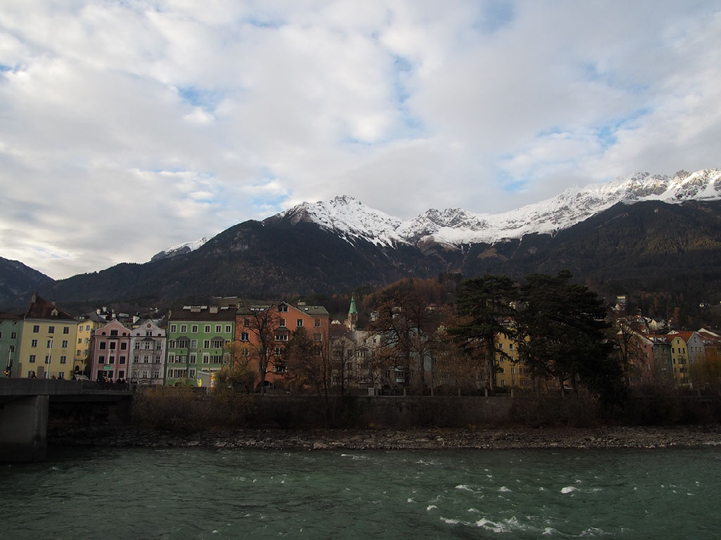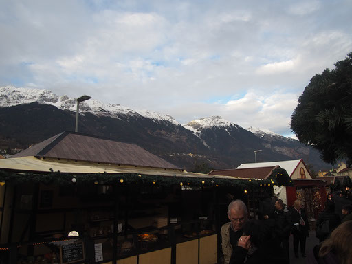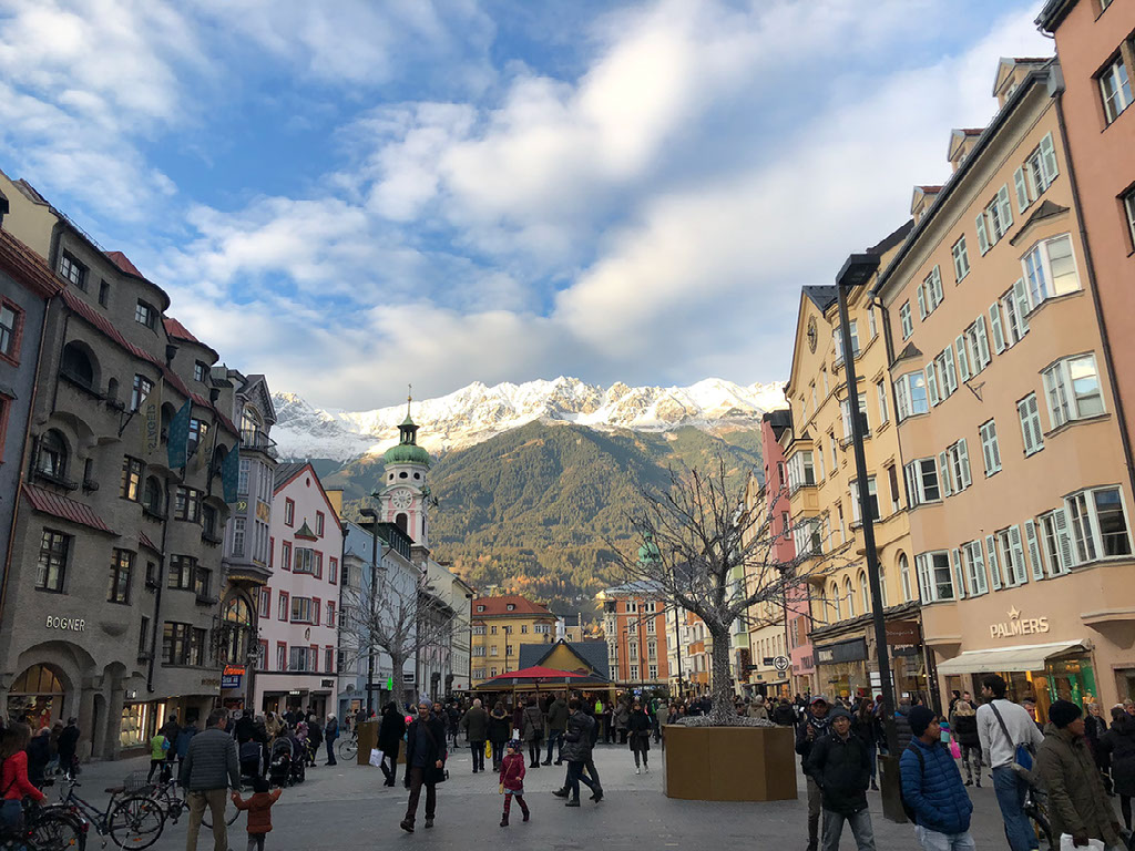 After just one gluhwein (plus the gin on the plane and a Buck’s Fizz back in the lounge) Helen proclaims she is “hammered”. I find this pretty remarkable tbh, but whatever. Maybe we’re at altitude? There are mountains around here after all, in fact you can barely help but see them. I am childishly fascinated and delighted by how there are glimpses of amazing scenery down most side roads in this city.