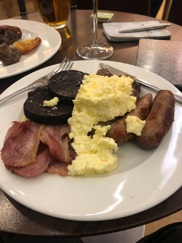 First Wing security is busy but efficient enough. Neither of us have our bags called out for extra inspection and soon enough we’re in the lounge. That’s also busy, but not so bad that we can’t easily find a seat near the food. Helen goes and fills a plate full of buffet breakfast while I wait to see someone who’ll take an order from the menu. By the time Helen’s back no-one has been past, so I go fill up my own plate of fry up awesomeness.