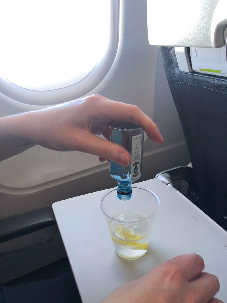 Obviously I am finding this mostly hilarious, and imploring Helen to try and take my Schadenforeman-lead and find all the horrors of this flight funny. It’s to no avail. Where’s this fucking gin? Ah, here’s this fucking gin. She pours it out, making sure to extract every last drop.