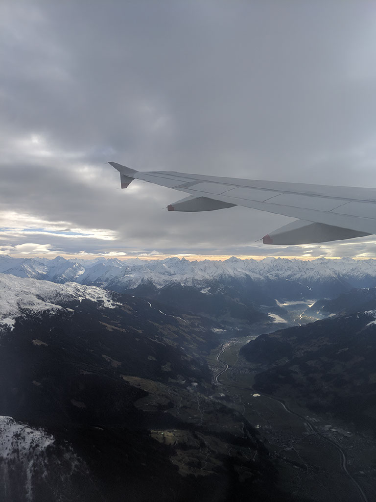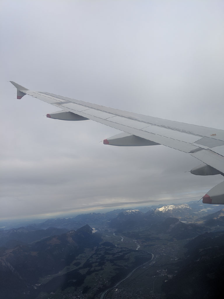 We haven’t circled for half an hour at all. In fact, we’ve touched down not too far behind schedule. Two sets of doors have stairs attached to them and soon enough we’re walking across the tarmac, marvelling at the fucking fantastic views in every direction. Seriously, I said this in December 2016 and I’m saying it two years on: fly to Innsbruck! It’s amazing!