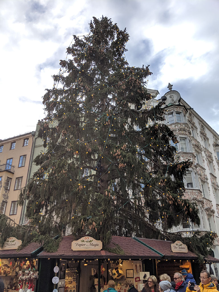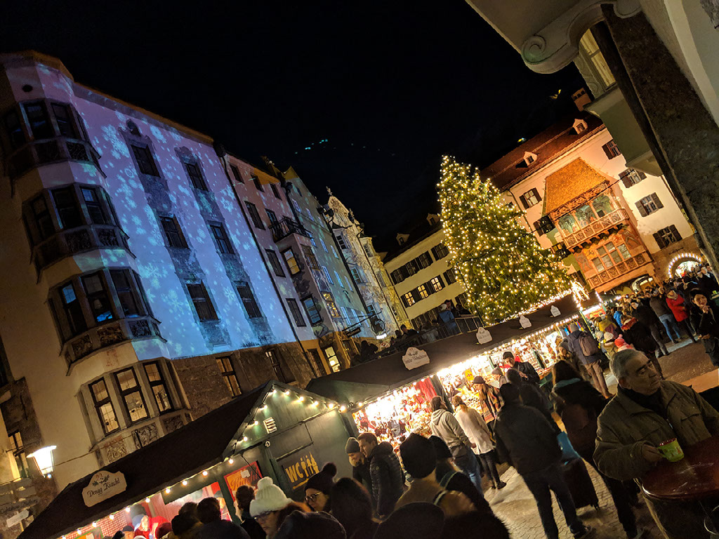 Back out into the main Christmas market near the Golden Roof and there’s a band playing brass music from a balcony. I guess that’s pretty cool. Virtually no-one is applauding or reacting in any noticeable way to it, mind. Also it’s dark, and falling snow is being projected onto one of the buildings next to the tree.
