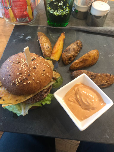 Our smiley waiter gives us menus, serves us some wine and a pint, and takes our food order which is delivered by a lad who seems to be 12 years old. I’ve gone for burger and chips, Helen has pasta. There is definitely enough mustard with my burger.