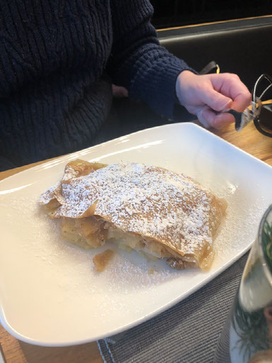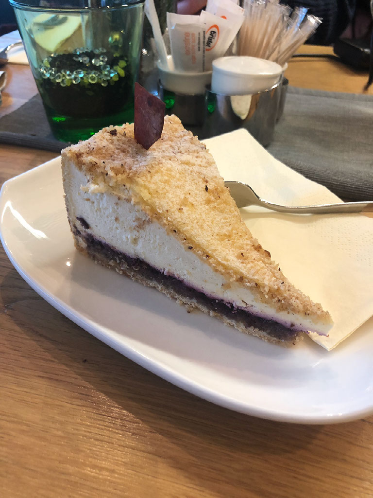 Since there’s enough time, and the portions were small, and it was our first calories of the day, we feel wholly justified in having dessert. I go for the Bergiseltorte, a speciality local cake in the shape of a ski jump (sort of) and which includes bacon. YES.