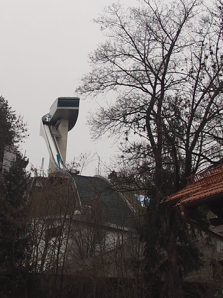 Heads spinning, we leave and walk through a park full of statues, past the big empty building that looks like it would make a nice pub, and towards the ski jumping stadium.
