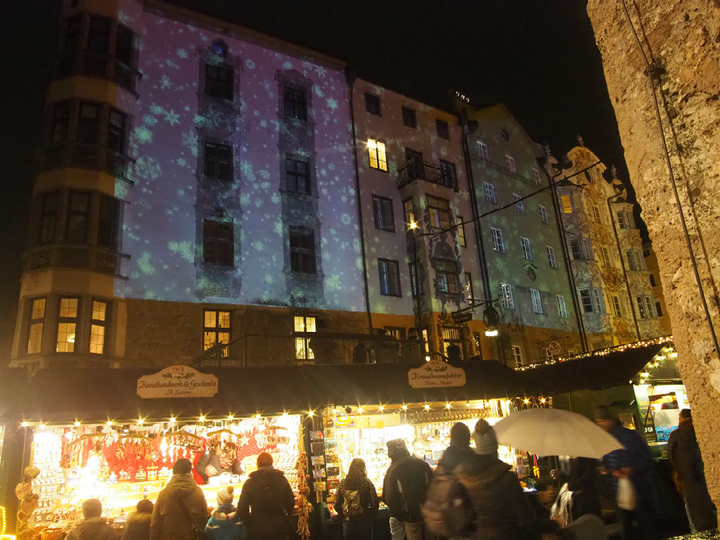 Once we’re done there it’s finally glühwein time. Because Helen wants a red one this time while I’m sticking with white, I somehow contrive to order half in German and half in Italian. Go me! The rain gets worse as we wander back up to the Golden Roof. I’m trying to convince Helen we should get raclette, but she’s not remotely hungry.
