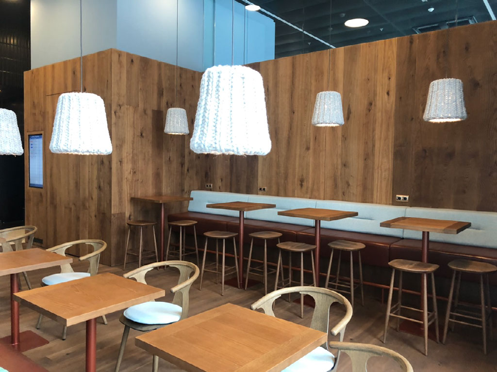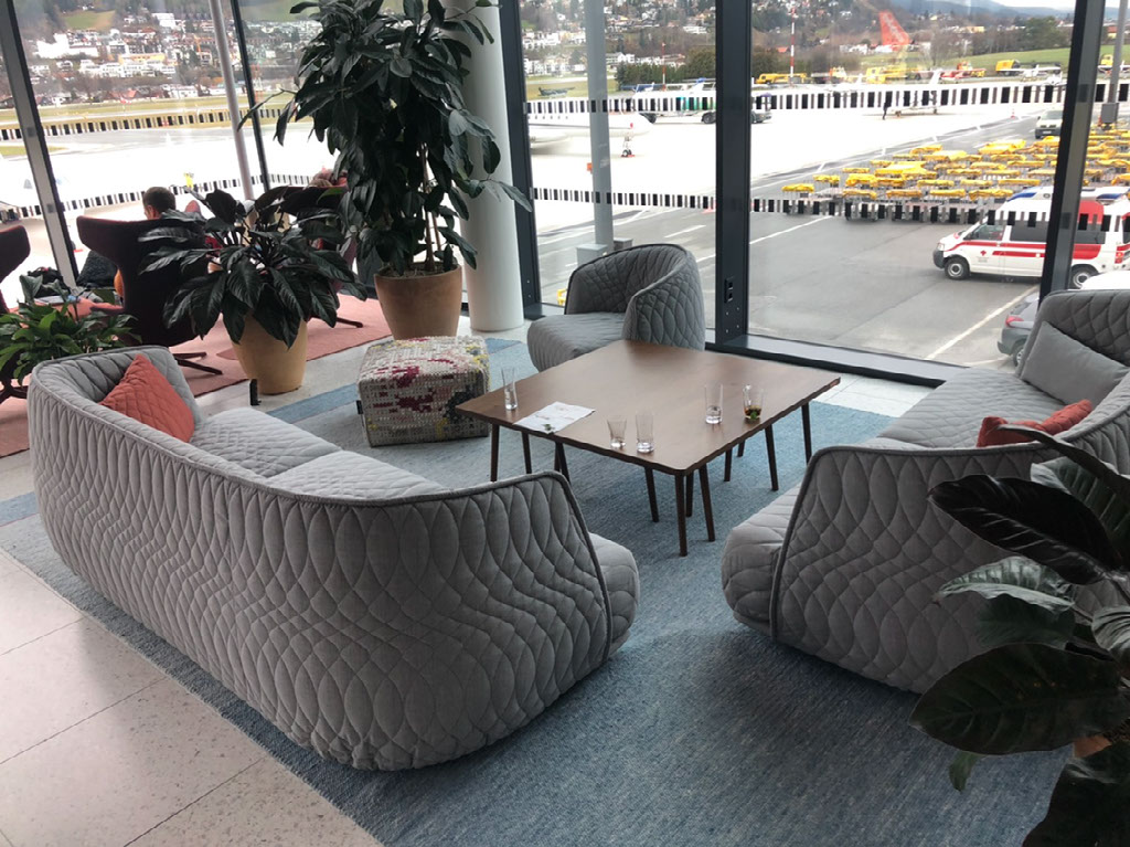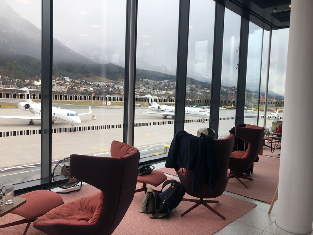It’s not a big place, but they’ve managed to have about 4 or 5 separately designed areas each giving a bit of a different feel. There’s food and booze and only one other person, and there are free seats by the floor to ceiling windows looking out directly onto the tarmac at all the parked private planes and across to the mountains. This is a winner.