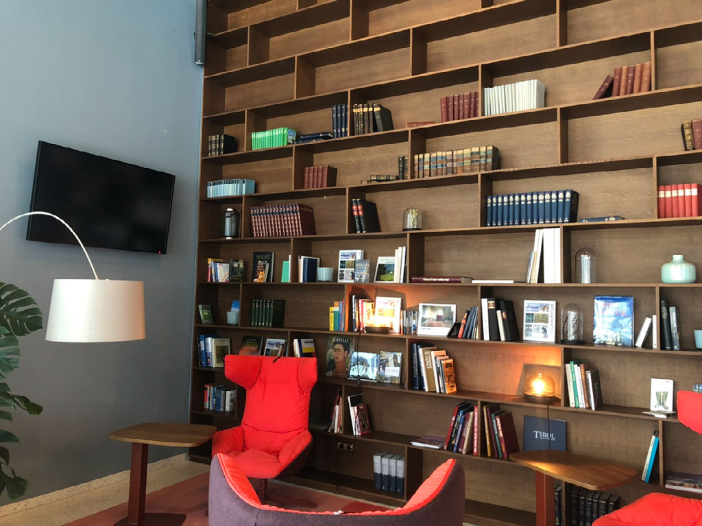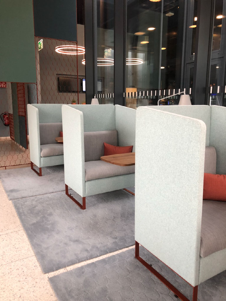Good job we got that earlier bus, then. Around the corner I’m able to rearrange everything back to how I want it and put my belt back on and oh, we’re at the lift that goes up to the lounge. Let’s get in the lift. Up on the first floor Helen’s face falls a bit as she thinks the awful seating area is the lounge - but no, it’s just another bit of regular seating next to the desk and hidden door. Inside the lounge proper and we’re amazed and delighted.
