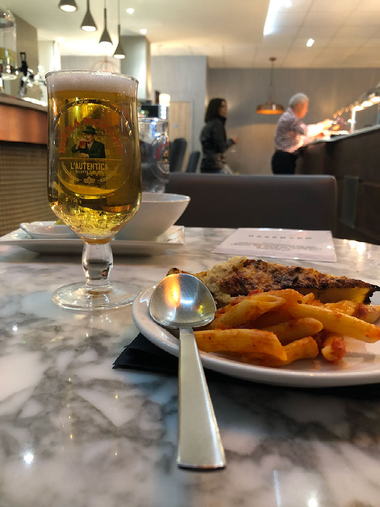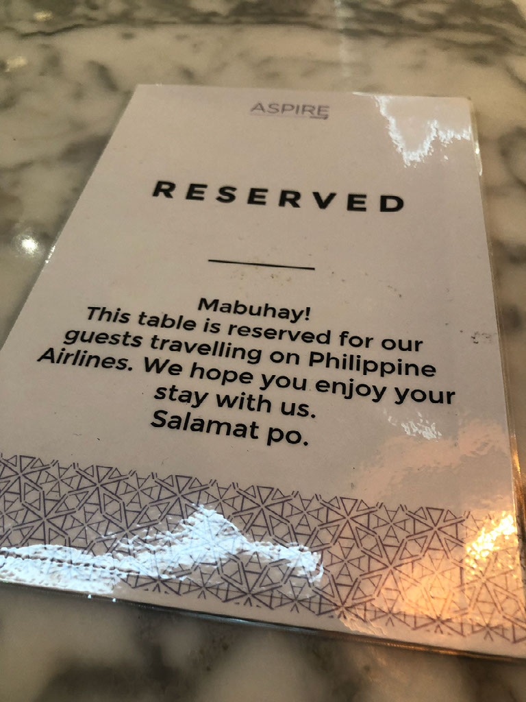 After handing over my boarding pass I expect to just be welcomed in, but actually I’m asked whether I’d like some indistinguishably prounced Filipino food. Eh? Well go on then. The lounge looks busy but there’s an empty table by the wall that seems out of place, I don’t know why it’s not taken – until I see the “reserved for Philippine Airlines” sign. Cool!