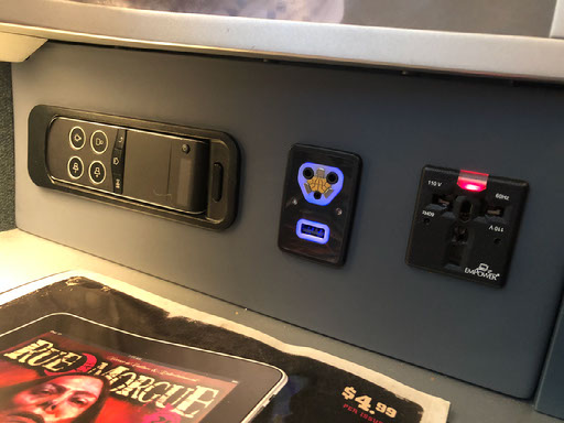 I finish eating at exactly the moment Shanghai Knights finishes. Next up, BlacKkKlansman. I stay awake for the first 20 minutes or so of it but then sleep for an hour; when I wake up I think, OK, give up on that, listen to some music and turn the seat into the fully flat bed it is. Hitting the recline button it gets about 40% of the way into position but then goes CLUNK and stops. I try again, the same thing happens. As I try a third time, there’s a power cut in the whole cabin: everyone’s screen and lights go off and the seat won’t move whatsoever, even back to its upright position.