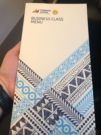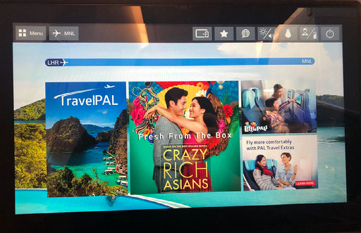When it does eventually start business class folk are allowed on at their leisure, so I’m ensconced in seat 3K in fairly short order. No booze is offered on the ground but I get a “Mabuhay punch” which is pretty nice. There was, in the last few days, an equipment change in my favour such that this plane has the same seats as the last one: big fancy screen, turns into a bed, etc etc, though the remote control is slightly different. Whatever. I’m very pleased to be flying like this.
