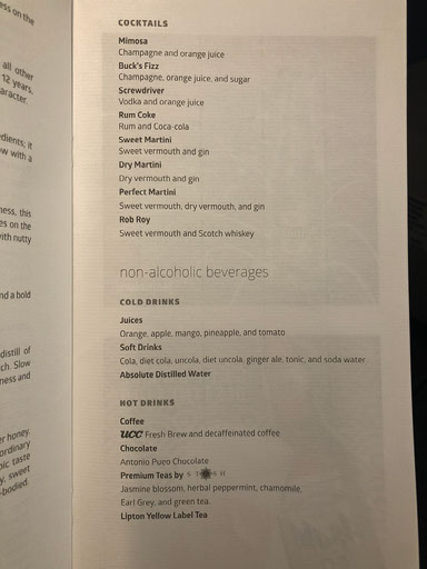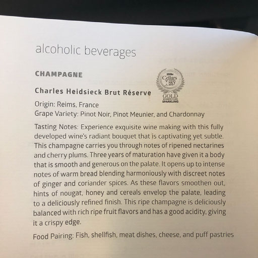 I put a bag up top and rest another by my feet, which themselves barely reach the footrest at the far end. A man named Paul comes along to serve me some champagne. Not a lot of champagne, just a tiny bit. It’s a good start though. Menus are already here and other drinks are also distributed; orange, raspberry, or jasmine. The speakers are playing instrumental slightly-jazzy covers of Bee Gees tunes.